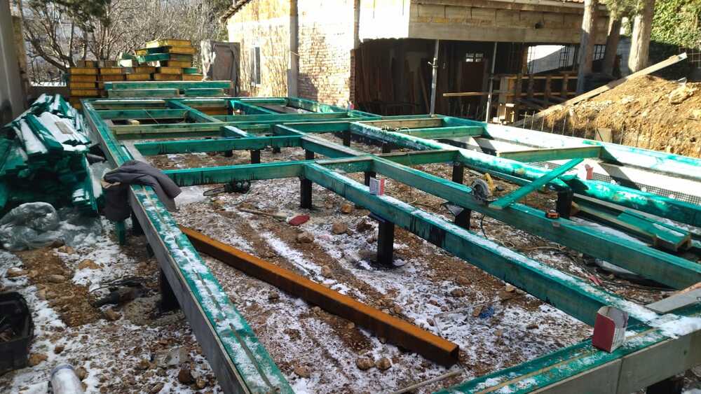 Ростверк изготовлен из калиброванного клееного бруса и защищен снаружи цементно-стружечной плитой
