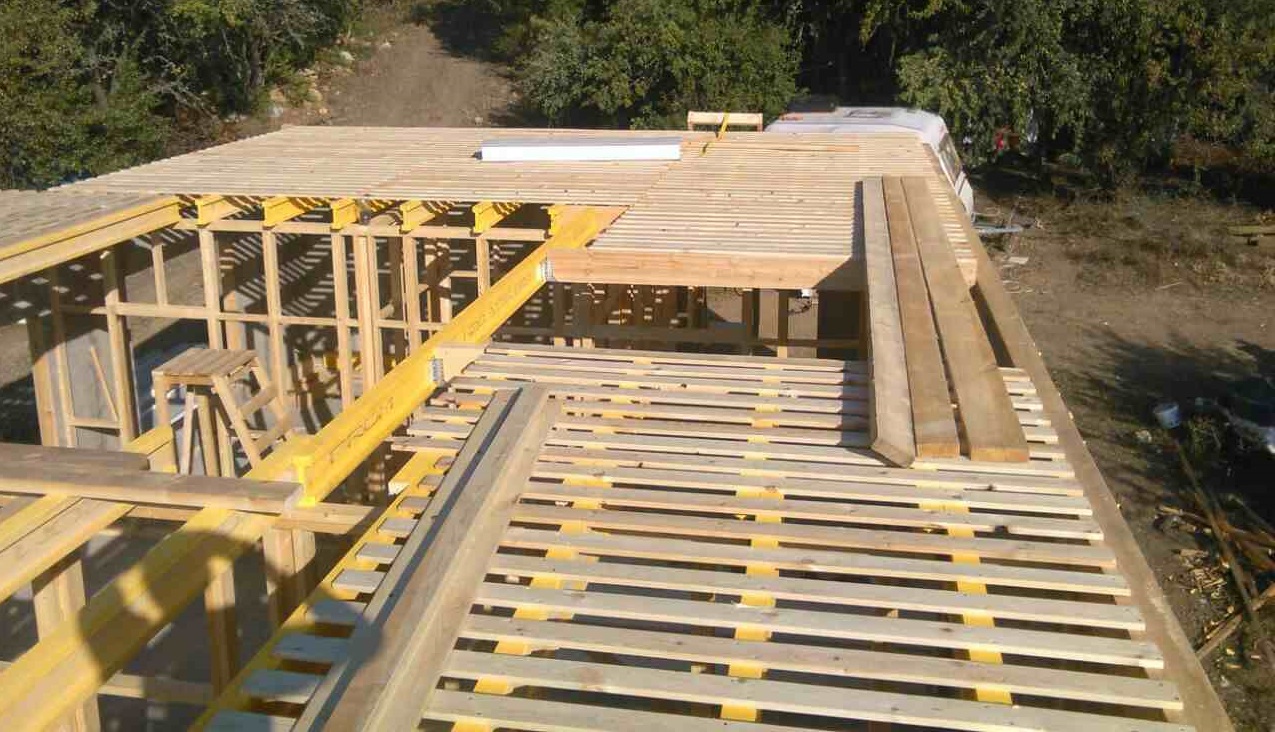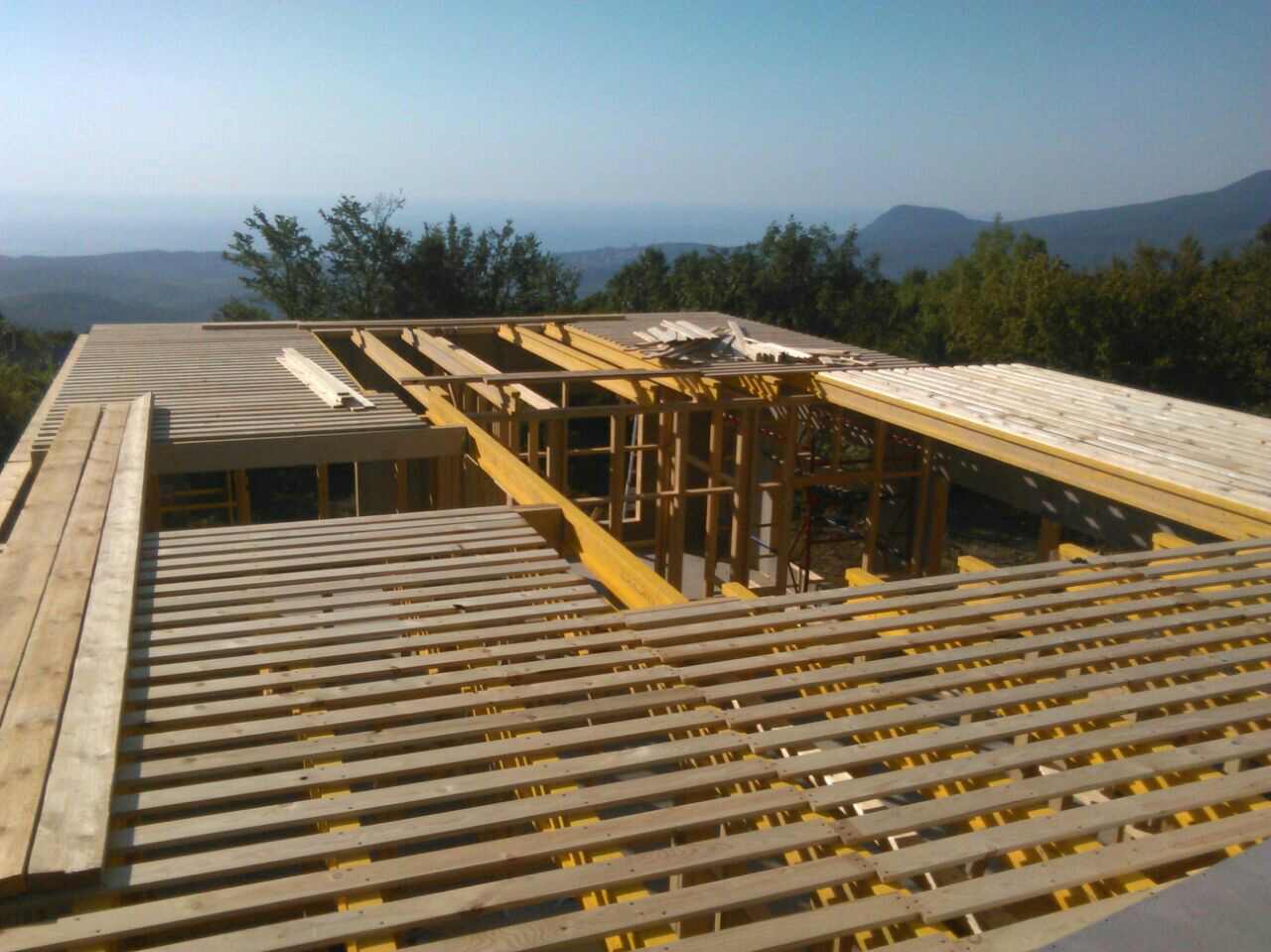 Кровля может быть построена из бруса 150х50мм или SIP панелей. В качестве кровельного материала можно использовать: металлочерепицу, битумную и керамическую черепицу. Также производим кровельные шовные сэндвич-панели.