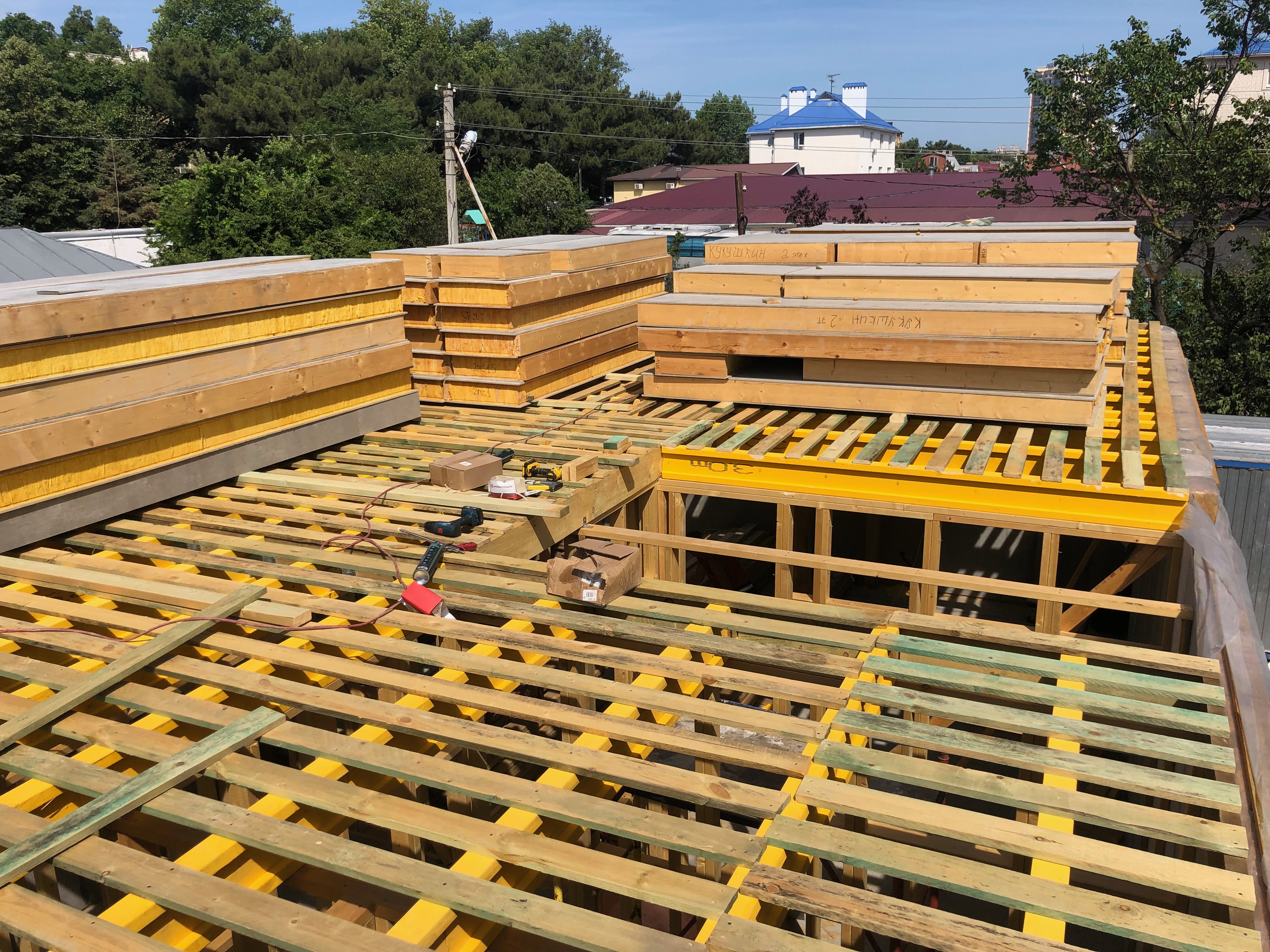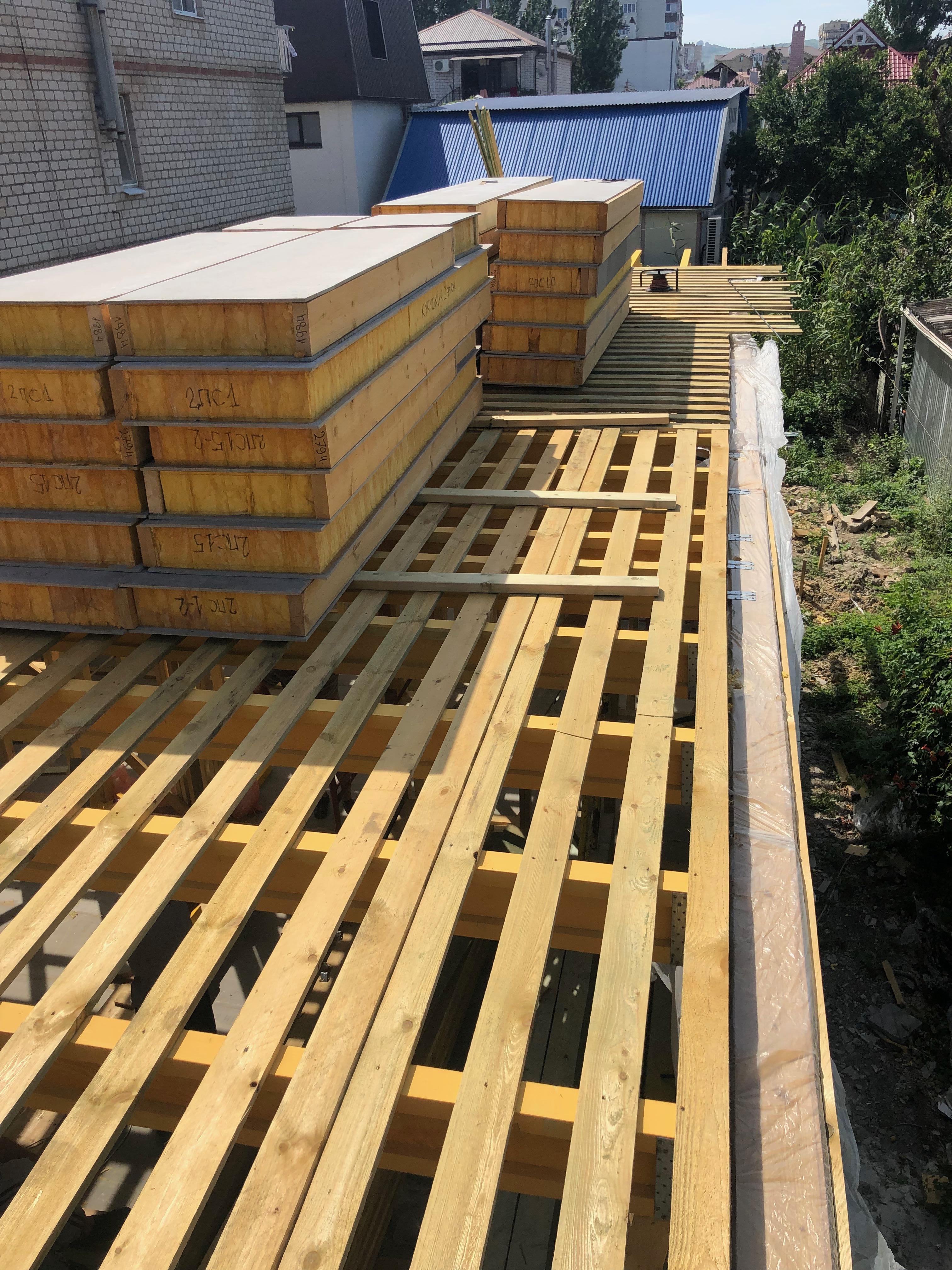 Кровля может быть построена из бруса 150х50мм или SIP панелей. В качестве кровельного материала можно использовать: металлочерепицу, битумную и керамическую черепицу. Также производим кровельные шовные сэндвич-панели.