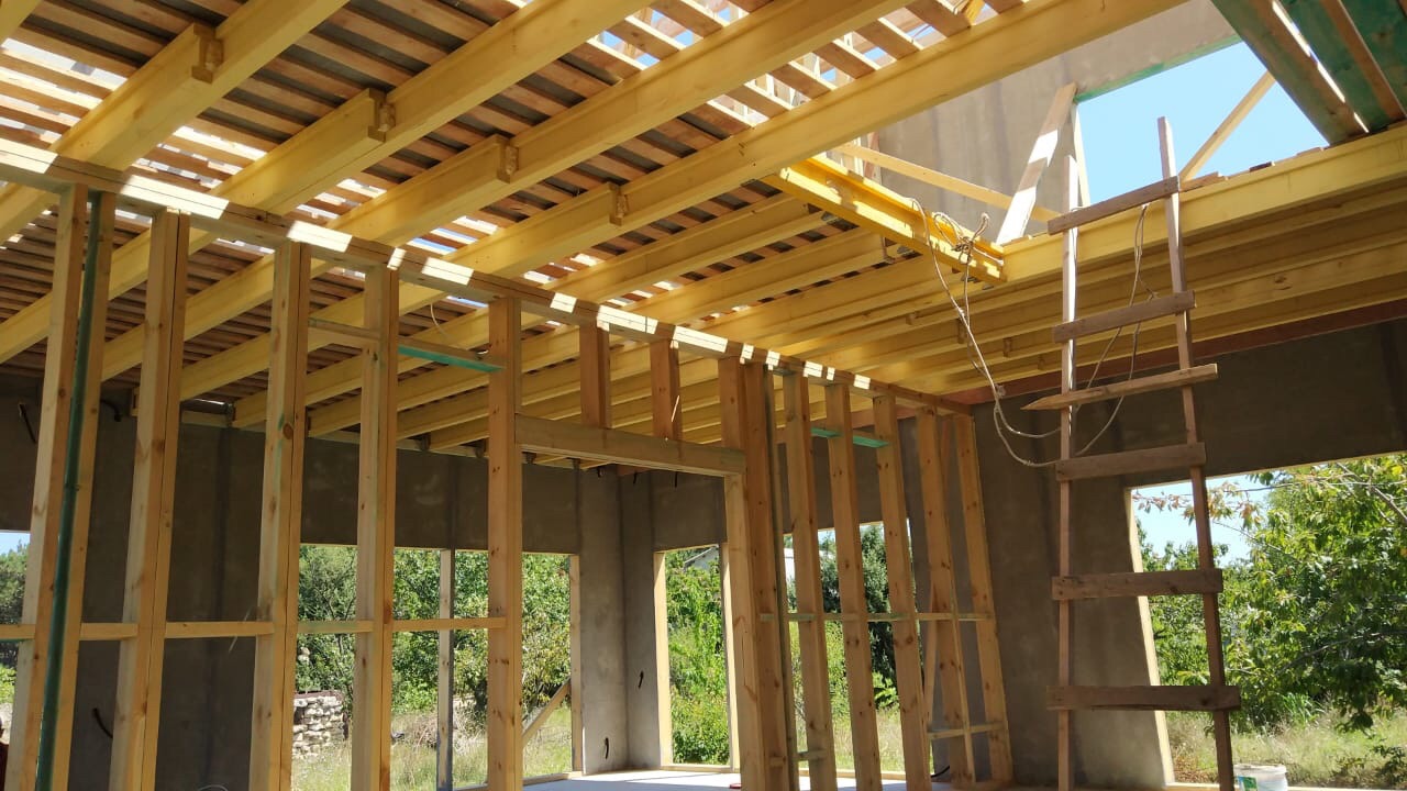 В межэтажных перекрытиях в качестве несущих лаг мы применяем двутавровые балки собственного производства с влагостойкой 24 мм. фанерой в сердечнике.