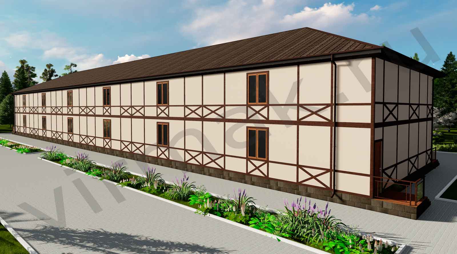 • Внутренние перегородки-каркас из сухой строганной доски: несущие 46х145 мм. Сборка в стоимость не входит