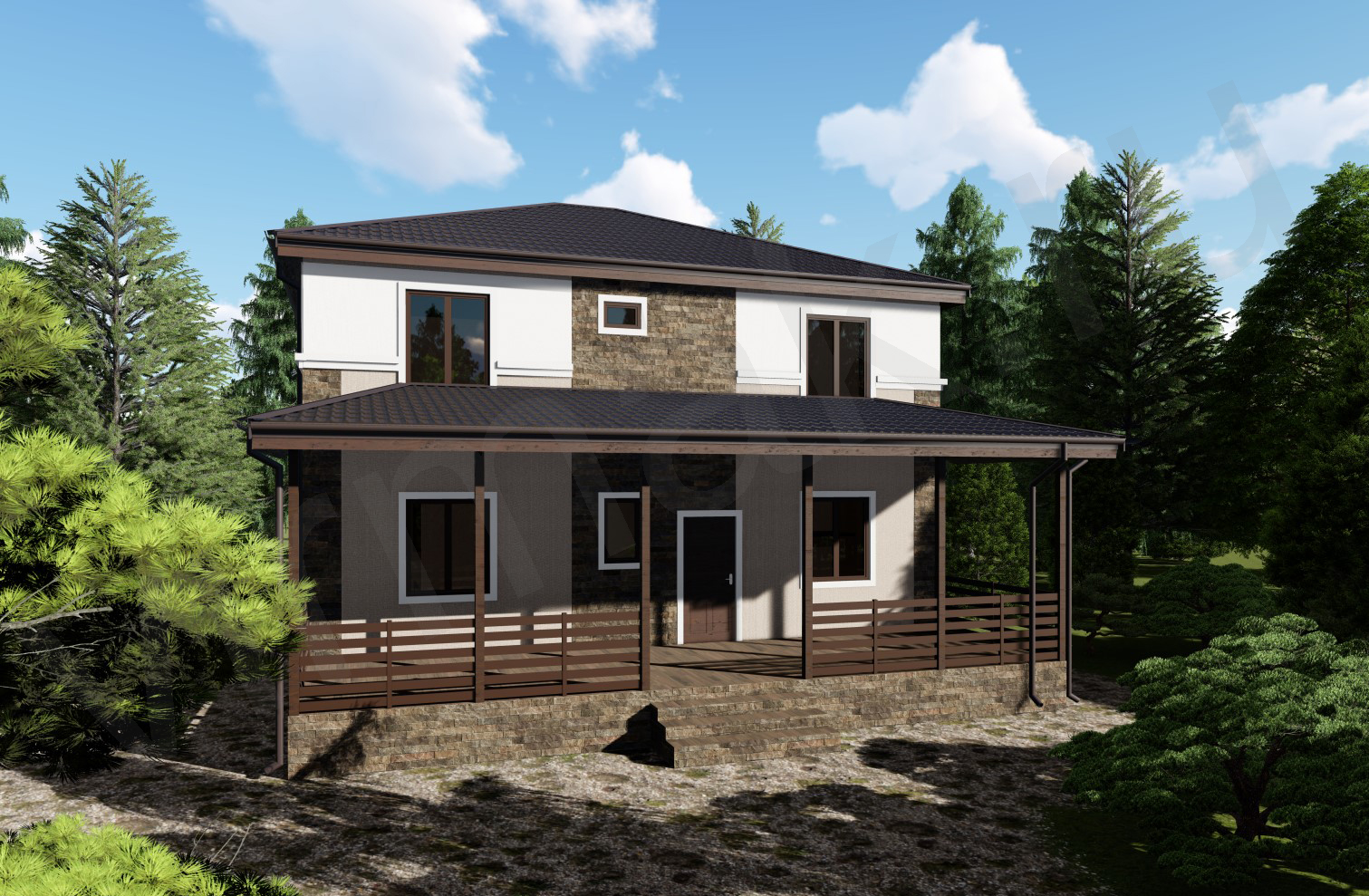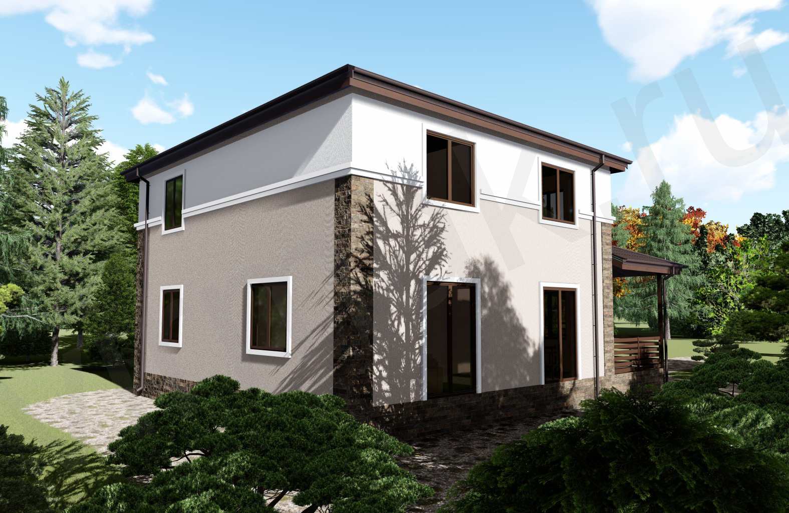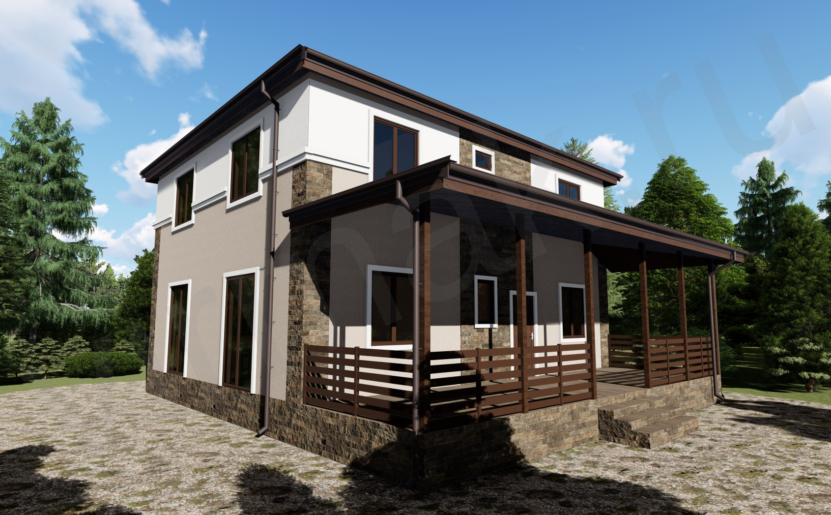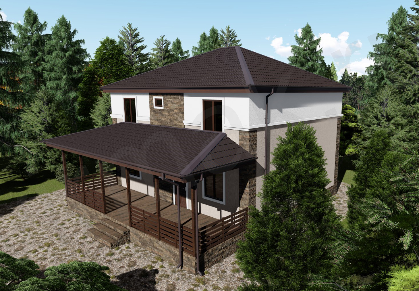 • Плоская или скатная утепленная кровля (пароизоляционная пленка, утеплитель вата на основе стекловолокна или базальта, гидро-ветрозащитная мембрана) с покрытием из металлочерепицы, полимерной мембраны или гибкой черепицы. (цена отличается от выбранного типа) (Ширина карнизного свеса от 30 см. Водосточная система в стоимость не входит