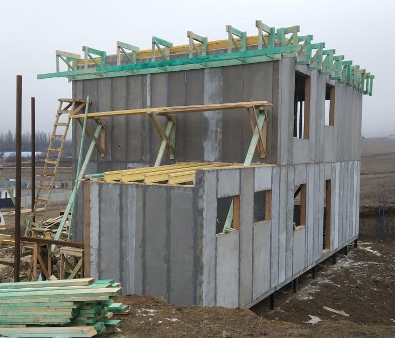 из СИП панелей из ЦСП размером 2700*1200*168 мм с антисептированным калиброванным пиломатериалом камерной сушки (46*140 мм). Монтаж каркасов несущих перегородок из пиломатериала 38*89 мм (76*89 мм).