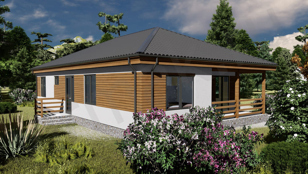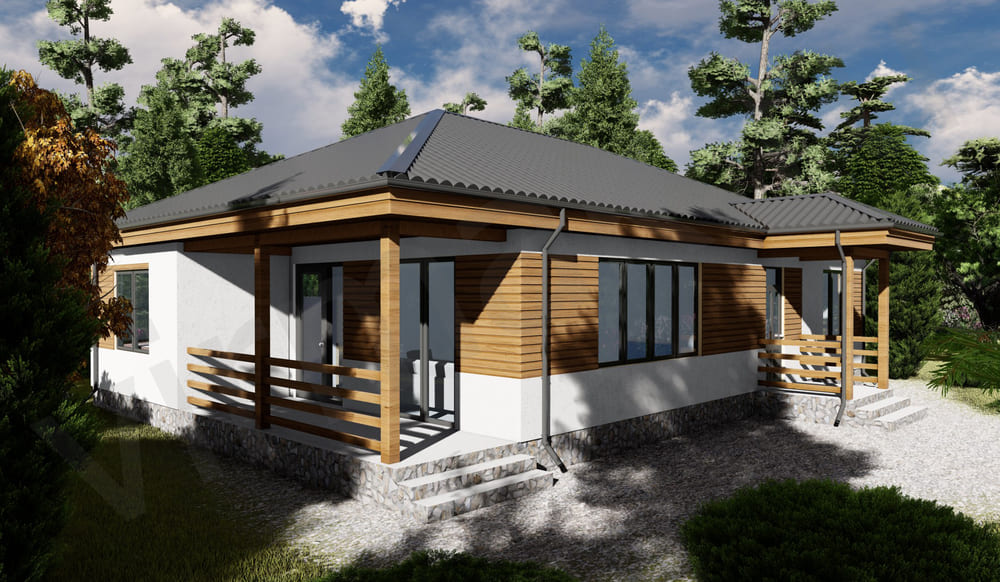 • Плоская или скатная утепленная кровля (пароизоляционная пленка, утеплитель вата на основе стекловолокна или базальта, гидро-ветрозащитная мембрана) с покрытием из металлочерепицы, полимерной мембраны или гибкой черепицы. (цена отличается от выбранного типа) (Ширина карнизного свеса от 30 см. Водосточная система в стоимость не входит