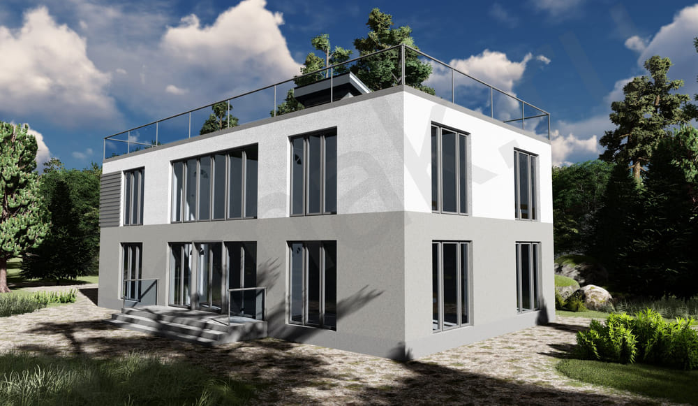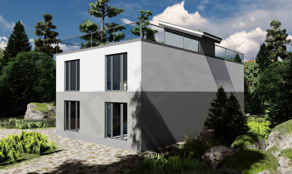 • Плоская или скатная утепленная кровля (пароизоляционная пленка, утеплитель вата на основе стекловолокна или базальта, гидро-ветрозащитная мембрана) с покрытием из металлочерепицы, полимерной мембраны или гибкой черепицы. (цена отличается от выбранного типа) (Ширина карнизного свеса от 30 см. Водосточная система в стоимость не входит